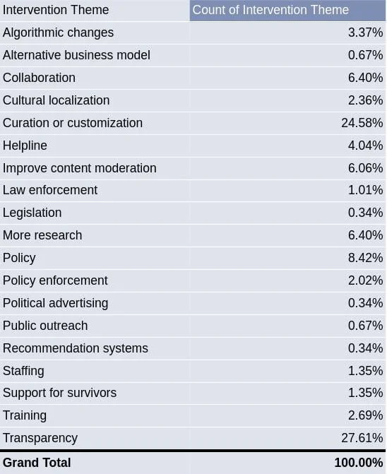 Within transparency-related interventions, reporting is the most common sub-theme (25%), followed by information-sharing (20%) and appeals (10%). Transparency-related interventions emphasize data-sharing on the scale of reported gendered abuse and on how platforms process, adjudicate, and resolve those reports, including appeals. This also includes transparency and data sharing around the appeals process. An example includes measuring the prevalence of gendered abuse and sharing data through corporate transparency reports.